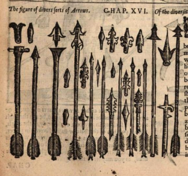 Arrows and darts are different amongst themselves both in matter and in form, in number, making, faculty/strength. In matter, for that some of them are wood, some are reeds, some are blunt headed, others have piles or heads of iron, brass, lead, tin, horn, glass, or bone. In figure, for that some are round, cornered, sharp pointed, barbed, some barbs stand to a point, or shafts, or else across, or both ways, but some are broad and cut like a chisel. For their size, some are three foot long, some less. For their number, they differ because some have one head, others have more. But they vary in making, for that some of them have the shaft put into the head, others the head into the shaft, some have their heads nailed to the shaft, others don’t, but have their heads loosely set on, that by gentle plucking the shaft, they leave their heads behind them, whence dangerous wounds proceed. But they differ in force, for that some hurt by their iron only, others by poison. You may see the other various shapes in the following figure.