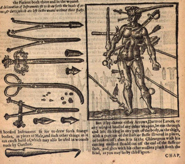 You must in drawing forth arrows shun incisions and dilacerations of veins and arteries, nerves and tendons. For it is a shameful and bungling part to do more harm with your hand than the iron has done. Now arrows are drawn forth two ways, either by extraction or impulsion. Now you must presently at the first dressing pull forth all strange bodies, which you is done more easily if you put the patient in the same posture as he was when he received the wound, and you must also have all your instruments ready. Especially that which has a slit pipe and toothed without, into which there is put a sharp iron style, like the gimblets we mentioned for removing bullets, but that is has no screw at the end, but is large and thick so to widen the pipe, that so widened it may fill up the hole of the arrows head whereinto the shaft was put, and so bring it out with it, both out of the fleshy as well as the bony parts, if the end of the shaft isn’t broken. That also is a fit instrument for this purpose, which opens the other end toothed on the outside by pressing together the handle. You’ll find the iron or head that lies hidden by these signs, there will be a certain roughness and inequality observable on that part if you feel it up and down with your hand; the flesh there will be bruised, livid or black, and there is heaviness and pain felt by the patient both there and in the wound.