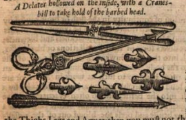 But if it chance that the weapon is so broken in the wound, that it cannot be taken hold on by the formerly mentioned mullets, then must you draw, or pluck it out with your crane, or crows-bill, and other formerly described instruments. But if the shaft is broken near the head, so that you can’t take hold of it with your crane-bill, then draw it forth with your gimblet which we described for drawing out bullets. If such a gimblet can be fastened in bullets, if might be far better to take hold of wood. Buf if the head is barbed, as the English arrows usually are, then if you can, it will be fitting to thrust them through the parts. For if they should be drawn out the same way they went in, there’d be no small danger of tearing the vessels and nerves by these hooked barbs. That’s why it’s better to make a section on the other side where the head entered, and give it passage forth if you can, for so the wound will be more easily cleansed and consolidated. But on the contrary, if the point tend to any bone, or have many muscles or thick flesh against the head thereof, as it happens sometimes in the thighs, legs and arms, then you must not thrust the head through, but rather draw it out the same way it came in, dilating the wound with instruments, and with skill in anatomy avoiding the larger nerves and vessels. So for this purpose put a hollow dilater in the wound, then take hold of both the barbs or wings of the head, then grab hold of the head with the crane-bill and pull all three out together.
